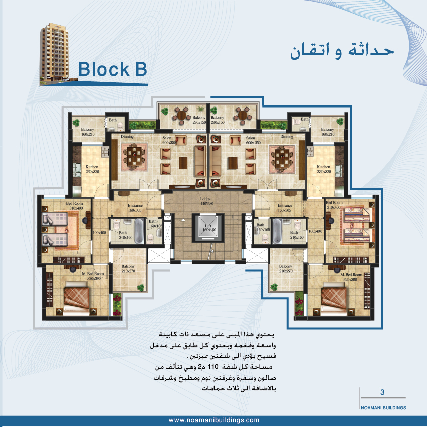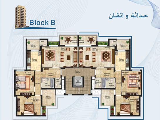 - Block B consisting of 11 floors having 2 apartments per floor of area 110 sq. meters each.