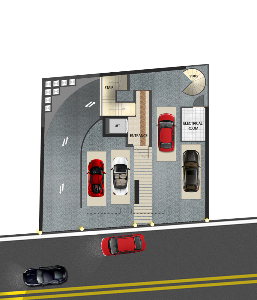 - Stamped textured concrete flooring to parking areas and entrances
